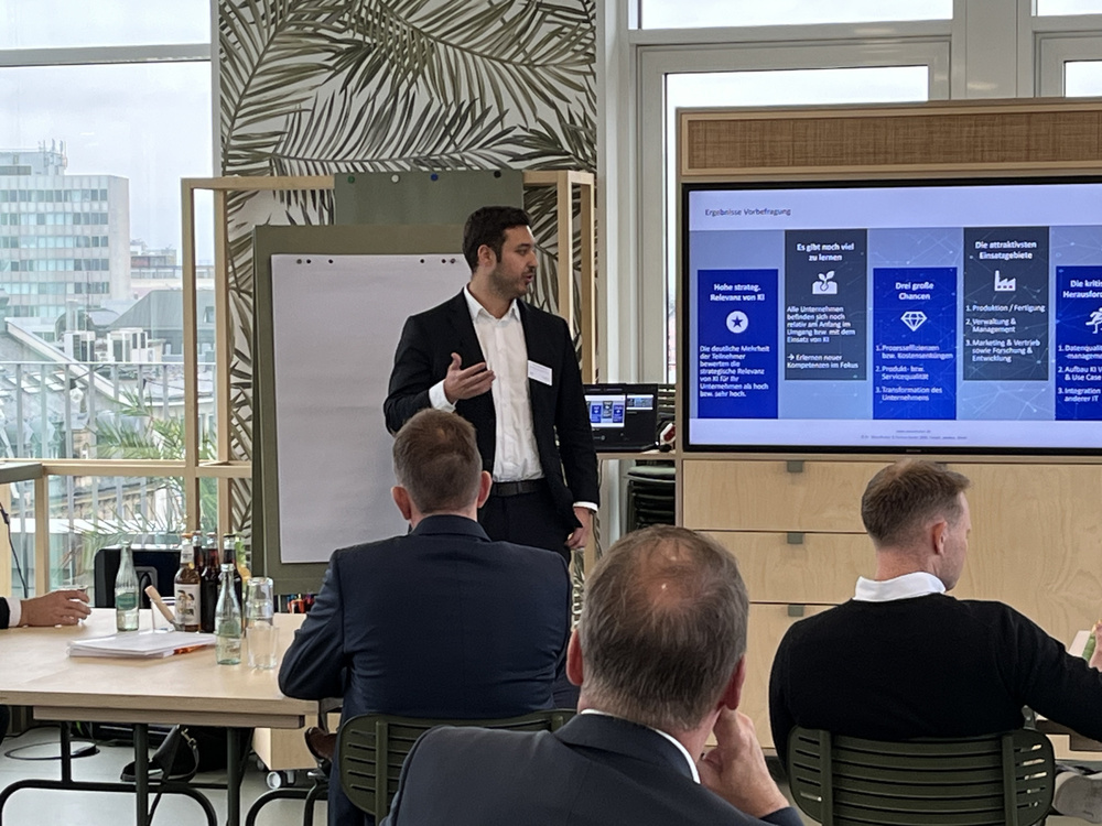 Stephan Hundertmark eröffnete mit der Einordnung von KI als transformatives Thema, das gerade in produzierenden Familienunternehmen und im Mittelstand enorme Relevanz gewinnt. Daran anknüpfend zeigte Prof. Dr. Thomas Hutzschenreuter auf, welche Zielvorgaben notwendig sind, um KI erfolgreich in die Unternehmensstrategie zu integrieren und über Agents und Use Cases in die Umsetzung zu bringen. Die Teilnehmer bestätigten in der Diskussion die zentrale Botschaft: KI ist Chefsache – sie transformiert Unternehmen in fast allen Bereichen, wer schneller handelt, gewinnt im Wettbewerb.