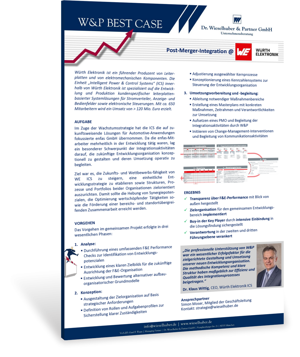 „Die professionelle Unterstützung von W&P war ein wesentlicher Erfolgsfaktor für die zielgerichtete Gestaltung und Umsetzung unserer neuen Entwicklungsorganisation. Die methodische Kompetenz und klare Struktur haben maßgeblich zur Effizienz und Qualität des Integrationsprozesses beigetragen,“ so Dr. Klaus Wittig, CEO, Würth Elektronik ICS.