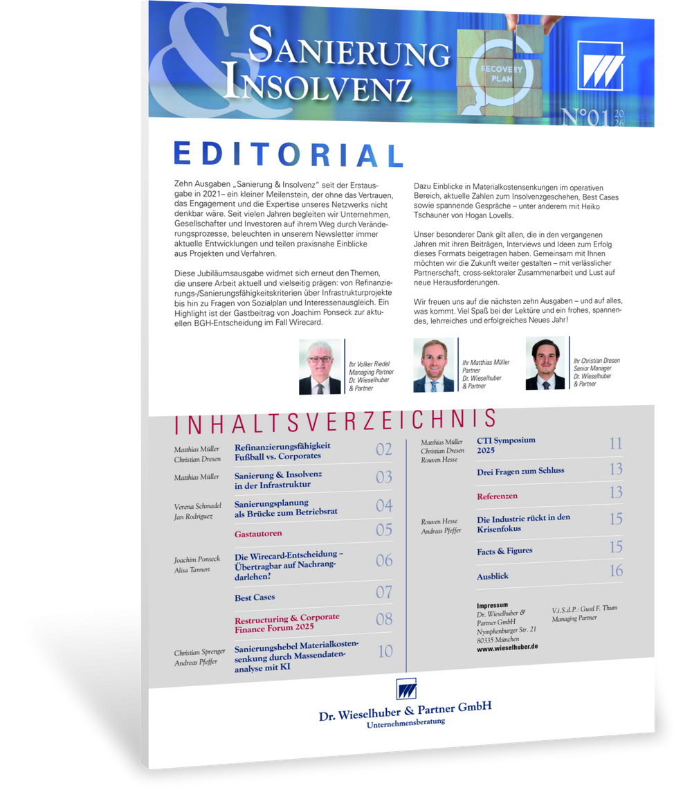 Diese Jubiläumsausgabe widmet sich erneut den Themen, die unsere Arbeit aktuell und vielseitig prägen: von Refinanzierungs-/Sanierungsfähigkeitskriterien über Infrastrukturprojekte bis hin zu Fragen von Sozialplan und Interessenausgleich. Ein Highlight ist der Gastbeitrag von Joachim Ponseck zur aktuellen BGH-Entscheidung im Fall Wirecard. Dazu Einblicke in Materialkostensenkungen im operativen Bereich, aktuelle Zahlen zum Insolvenzgeschehen, Best Cases sowie spannende Gespräche – unter anderem mit Heiko Tschauner von Hogan Lovells.