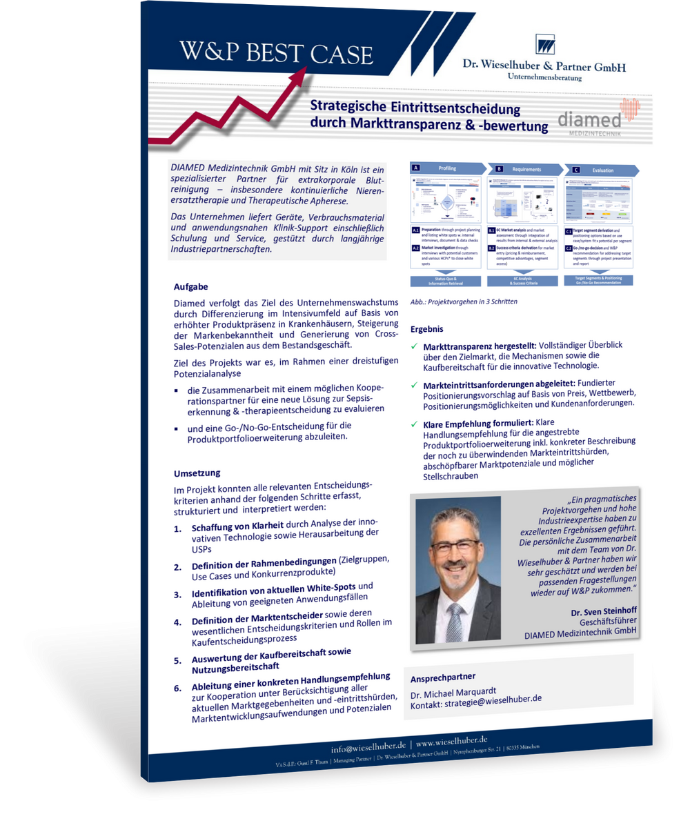 „Ein pragmatisches Projektvorgehen und hohe Industrieexpertise haben zu exzellenten Ergebnissen geführt. Die persönliche Zusammenarbeit mit dem Team von Dr. Wieselhuber & Partner haben wir sehr geschätzt und werden bei passenden Fragestellungen wieder auf W&P zukommen,“ so Dr. Sven Steinhoff Geschäftsführer DIAMED Medizintechnik GmbH.