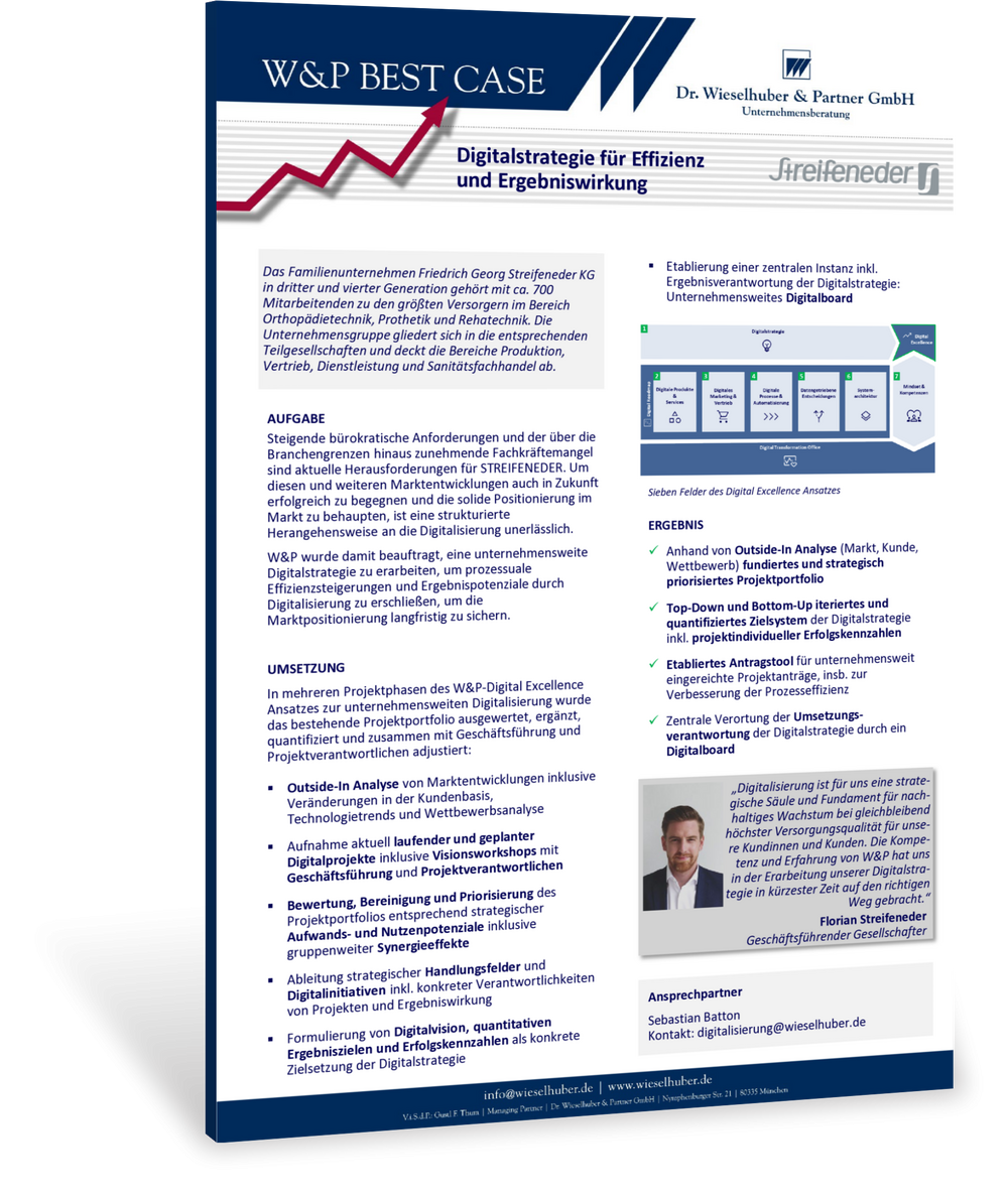 Das Familienunternehmen Streifeneder zählt zu den größten Anbietern in der Orthopädietechnik, Prothetik und Rehatechnik und steht vor wachsenden Herausforderungen wie insbesondere dem anhaltenden Fachkräftemangel und überbordender Bürokratie. Gemeinsam mit Dr. Wieselhuber & Partner (W&P) wurde eine umfassende Digitalstrategie entwickelt, um Effizienzsteigerungen zu erzielen und die Wettbewerbsfähigkeit langfristig zu sichern. Im Rahmen des W&P Digital Excellence Ansatzes wurden laufende und geplante Digitalprojekte analysiert, priorisiert und ein unternehmensweites Digitalboard etabliert, um die Umsetzung und Verantwortung der Digitalstrategie zentral zu verankern.