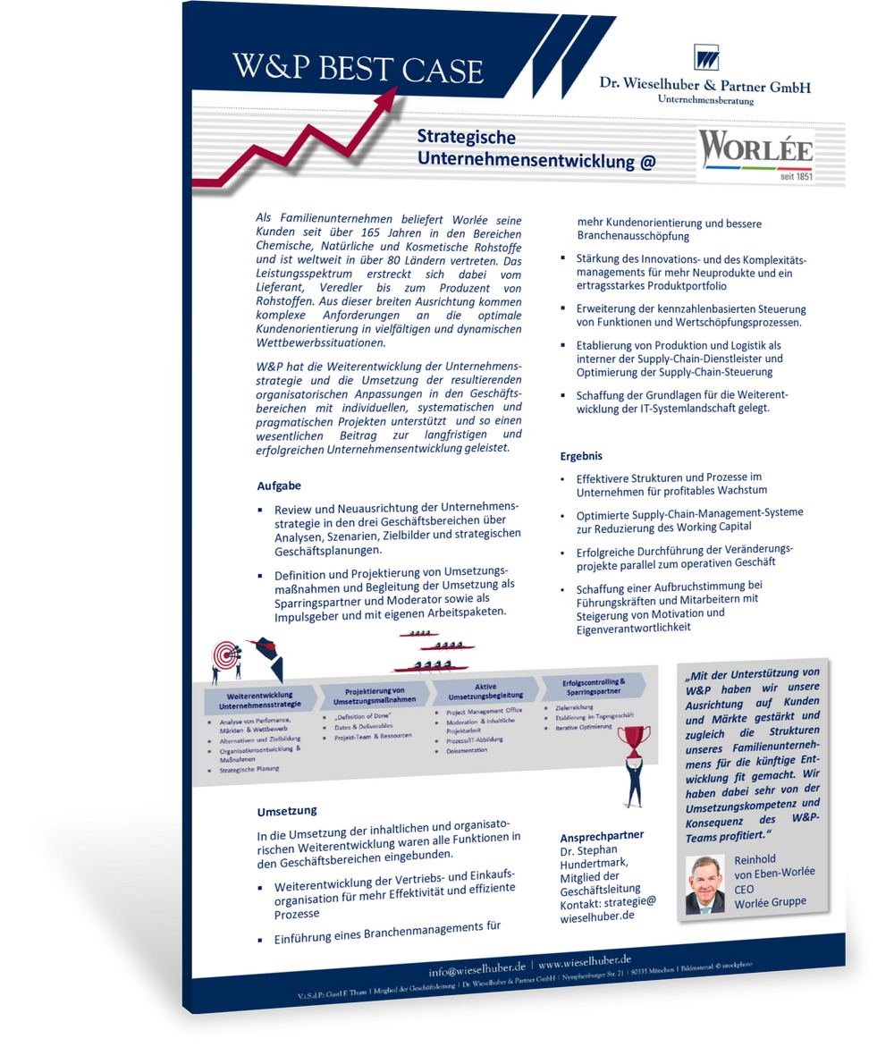 „Mit der Unterstützung von W&P haben wir unsere Ausrichtung auf Kunden und Märkte gestärkt und zugleich die Strukturen unseres Familienunternehmens für die künftige Entwicklung fit gemacht. Wir haben dabei sehr von der Umsetzungskompetenz und Konsequenz des W&P-Teams profitiert“, so Reinhold von Eben-Worlée CEO Worlée Gruppe.