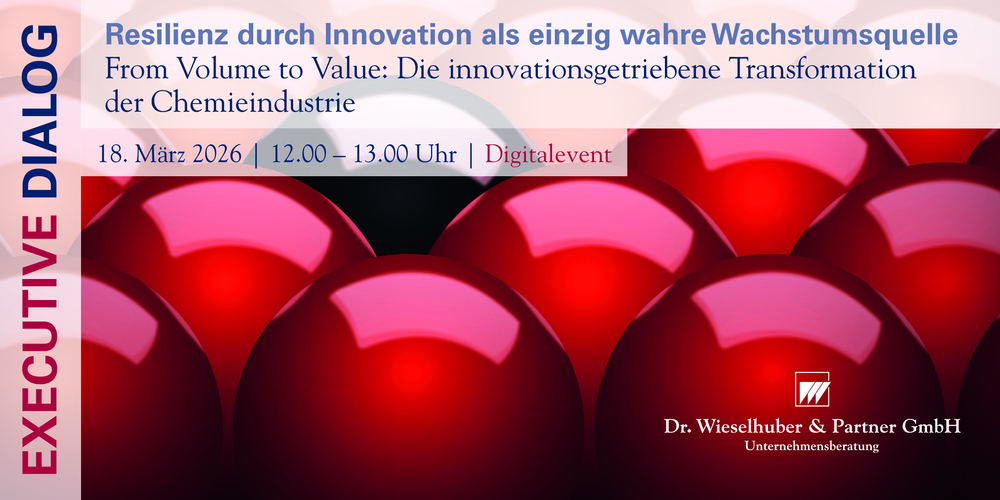 In unserem Executive Dialog am 18. März 2026 (12:00–13:00 Uhr, online) diskutieren wir, wie Chemieunternehmen den Schritt „From Volume to Value“ schaffen – und Innovationskraft in profitable Geschäftsmodelle der nächsten Dekade übersetzen. Freuen Sie sich auf Impulse zur innovationsgetriebenen Transformation der Chemieindustrie – mit anschließender Werkstatt-Diskussion & Q&A.