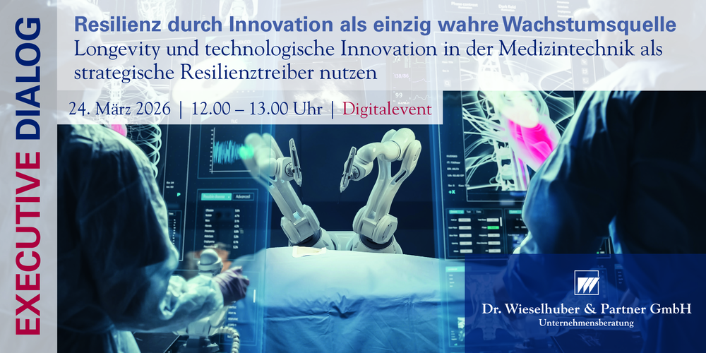 In unserem Executive Dialog am 24. März 2026 (12:00–13:00 Uhr, online) zeigen wir, wie Pharma- und MedTech-Unternehmen Longevity und technologische Innovation strategisch nutzen und in konkrete Marktimpulse überführen. Freuen Sie sich auf Perspektiven zur marktnahen Produktkonzept- und Marktbewertung, zu zentralen Innovationshürden und Stellhebeln für eine schnellere Time-to-Market sowie zu ungenutzten Innovationspotenzialen und deren konsequenter Hebung – mit anschließender Werkstatt-Diskussion & Q&A.