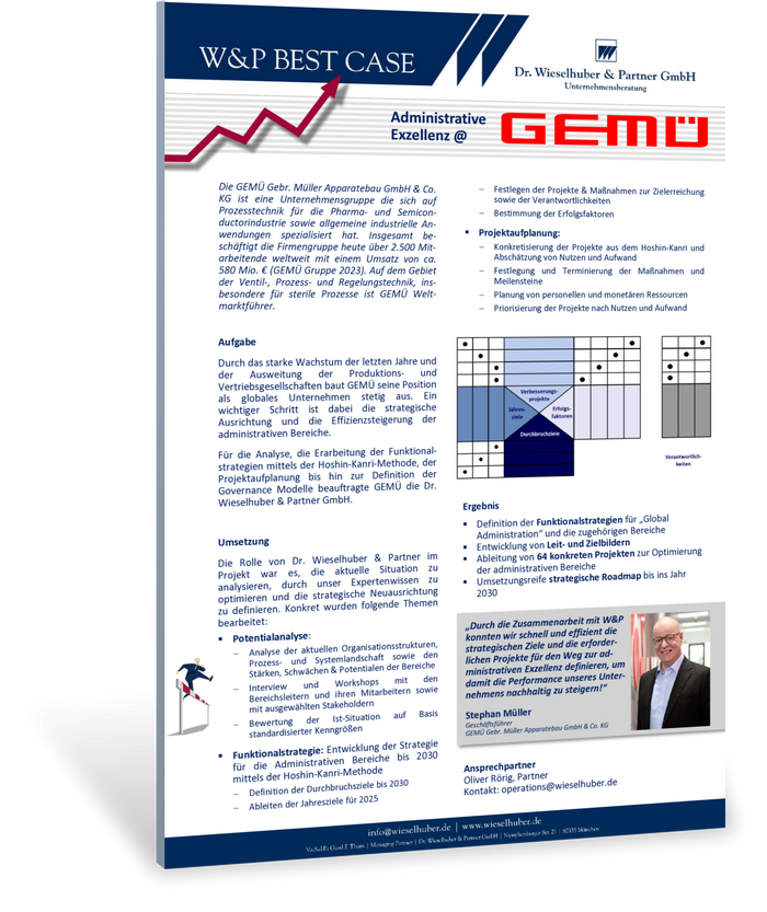 - Funktionsübergreifende Exzellenz: End-to-End Verbesserungsmaßnahmen u.a. im Auftragsabwicklungsprozess, dem Sales- & Operations-Planning-Prozess (S&OP), dem Produktentstehungsprozess (PEP) sowie in den Bereichen Life Cycle Management, Innovation (PIP) sowie Qualitätsmanagement durch nahtlose Zusammenarbeit und Integration zwischen den verschiedenen Abteilungen und Funktionsbereichen. Neben klassischen Funktionsinterviews und Systemanalysen können hierbei auch weitere Erkenntnisse bspw. über Process-Mining gewonnen werden um anschließend die Schwachstellen zu beheben und Optimierungsmaßnahmen sowie Prozessautomatisierungen erfolgswirksam umzusetzen.